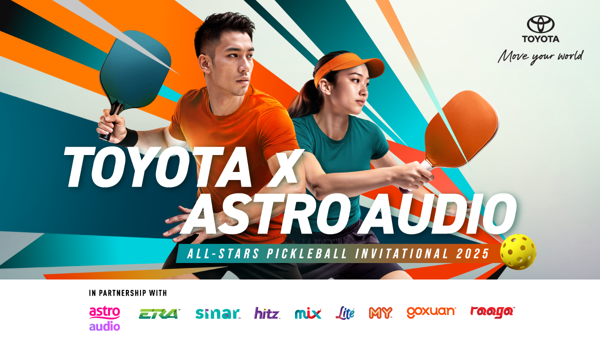 首届“Toyota X Astro Audio 匹克球邀请赛”隆重举办, 分别由8队Toyota Teams (Toyota客户专属) 和8队Astro Audio (Astro电台听众专属) 组成, 每支队伍都有你喜爱的Astro DJ领军!