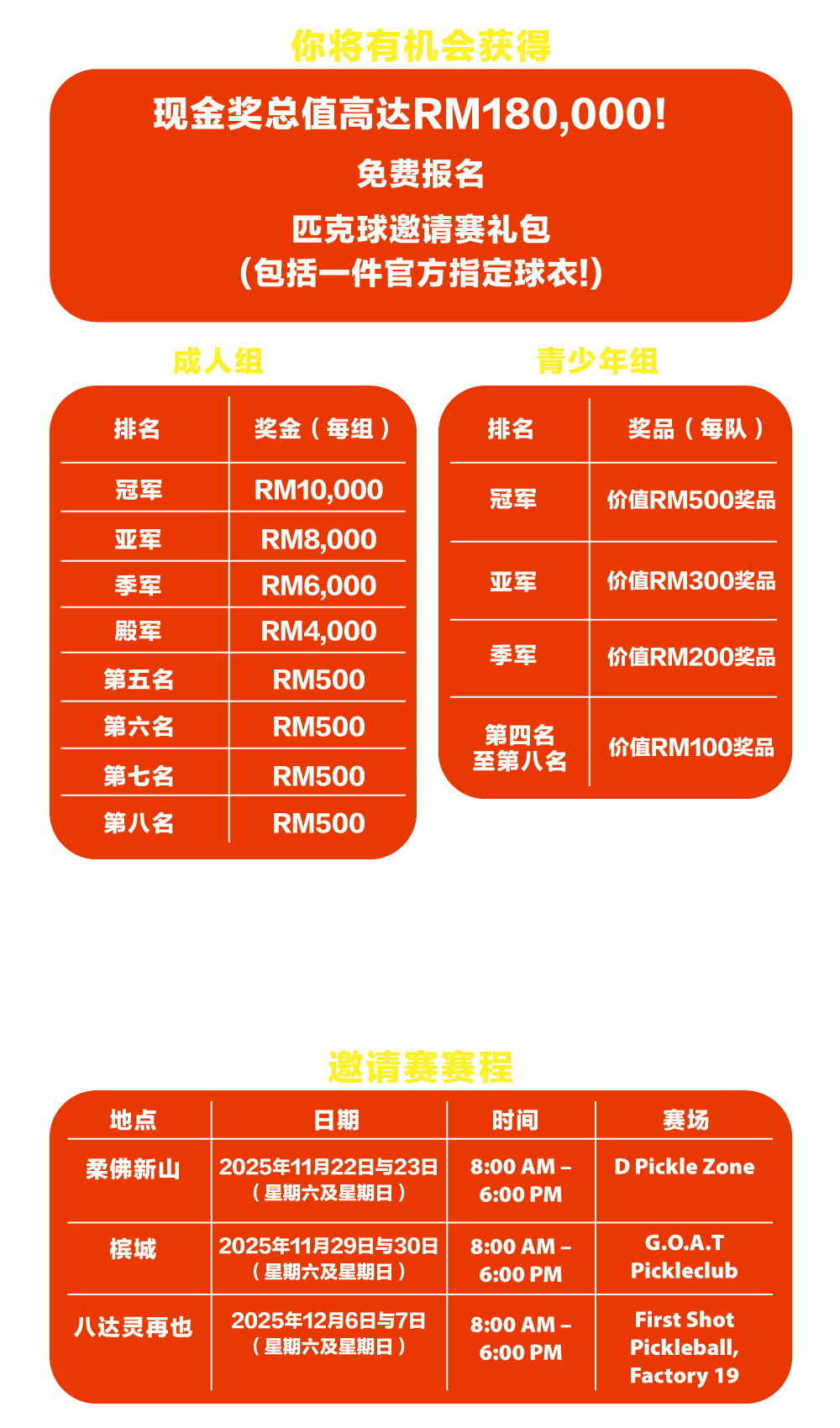 还有,如果你是DUPR评分为3.5或以下,或尚未拥有DUPR评分的朋友,欢迎参加这场匹克球邀请赛,无论是男子双打、女子双打、混合双打或青少年双打项目!