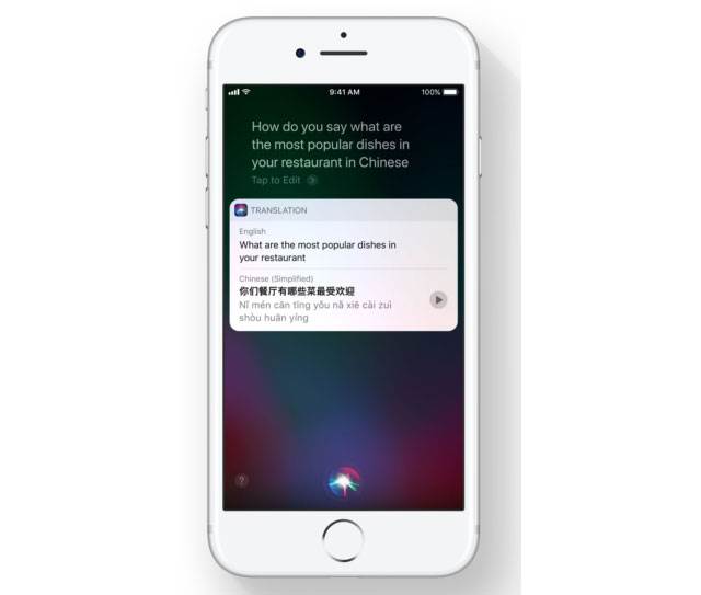 Siri 将支持实时翻译,能够将英文短语和单词翻译成中、法、德、意等多种语言。
